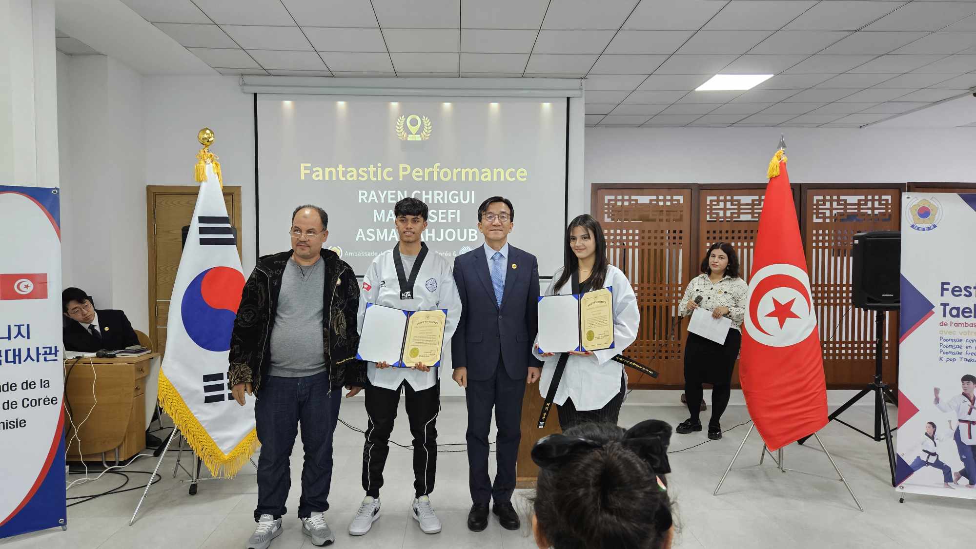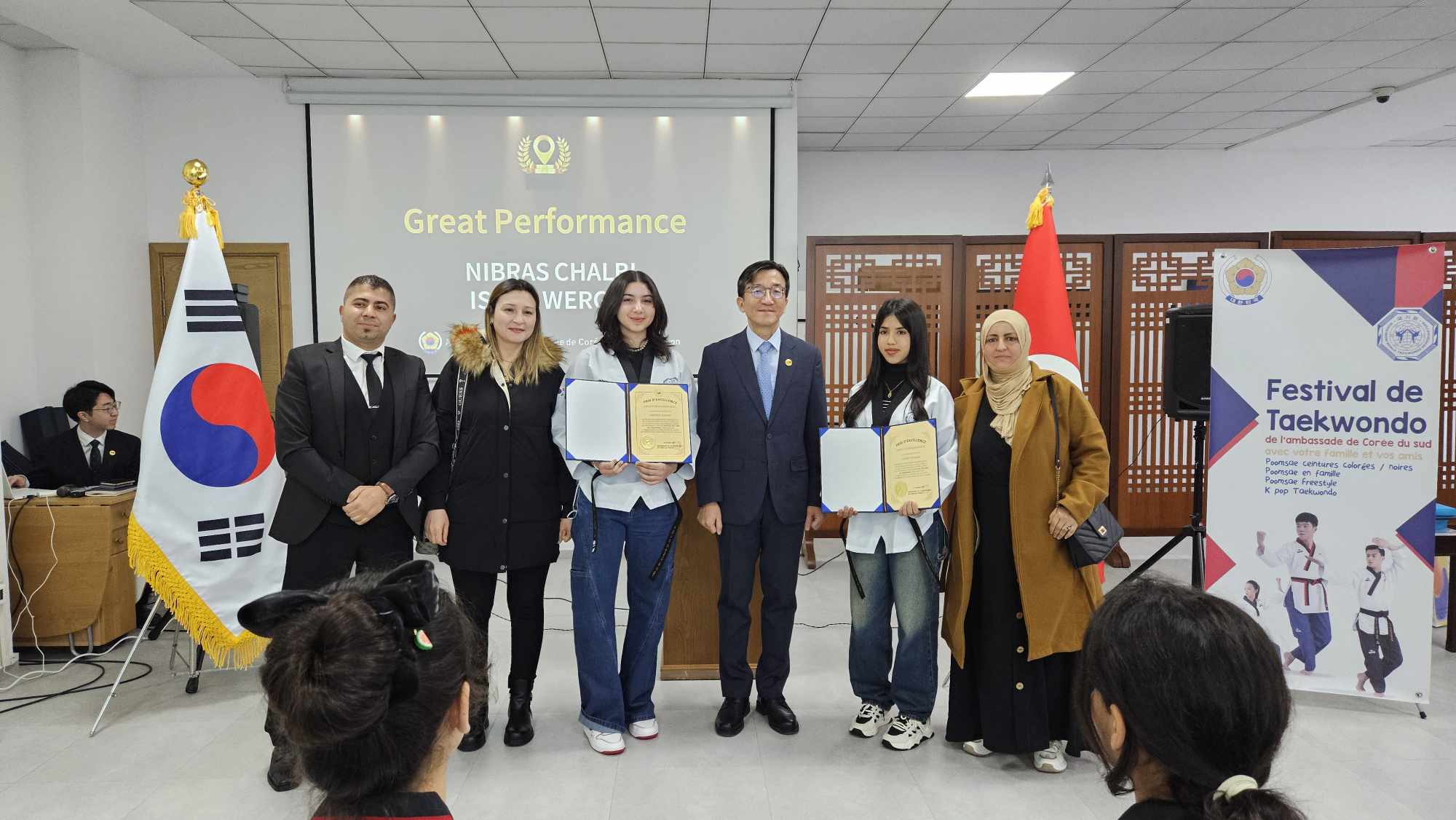 2025. 2.8.(토) 대사관에서 2024 가족 친구와 함께하는 온라인 태권도축제의 시상식이 개최되었습니다. 수상자들은 기념도복과 각자 이름이 한글로 새겨진 품띠, 소정의 기념품을 선물로 받았습니다. 수상자 외 100여명의 참가자들에게도 참가상과 한글 이름 품띠를 준비하였습니다. 참여해주신 선수들의 열정에 박수를 보냅니다!